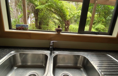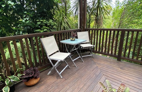 Town Escape is a quiet relaxing accommodation with enjoyable water views through a canopy of native bush and surrounded by gardens. A private apartment under an existing dwelling. This unique property gives you the feeling of rural life while still being right in town. As you drive down the shared driveway to the guest parking you'll enter a sustainable organic garden and orchard that has a variety of fruit and citrus trees. Large glass surrounds maximizes the views to be found in the bush reserve and garden. The large deck surrounding the apartment also offers a serene outdoor dining area. On main route to surf beaches only 10 mins away or park up your car and have a scenic walk to cafes and beaches 5-10 mins. away. Tennis courts and sports fields across road at the local school. Immediately behind us is the track that traverses the Kaitoke Estuary. Great for fitness or to view the scenery or marvel at the bird and estuary life. After a day out either at our beautiful beaches or exploring the region's many adventures relax in the peaceful environment of this apartment.