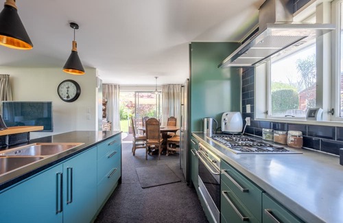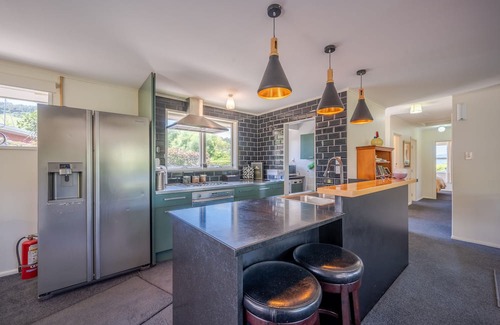 This family-friendly holiday home is well-equipped with fans for those hot summer days, an expansive deck to soak up all-day sunshine, a BBQ for classic Kiwi summer meals, and an outdoor shower to rinse off after water adventures.
