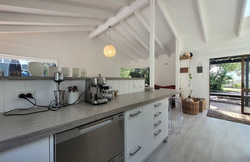 Pauanui Beach Break is the perfect home for two families to holiday together. The bach has three bedrooms and a sleepout. Two bedrooms have queen beds while the third has two singles. The bathroom has a shower and hand basin. The toilet is separate. As you walk into the home, you will see the dining area leading into the well-appointed kitchen with a large fridge and dishwasher. From there you will find the lounge with comfortable seating and a flat-screen TV. Head out of the bi-fold doors onto the sunny patio with an outdoor dining table and BBQ. And check out the fantastic back garden, with plenty of room for the kids to play, and a trampoline so they will be kept busy for hours. The sleepout also has access to the lawn area and is great for older kids. There is a double bunk bed, a TV, a bathroom and a kitchenette so your older teens are well catered for! With parking for the car and boat, everyone will be happy on this holiday!