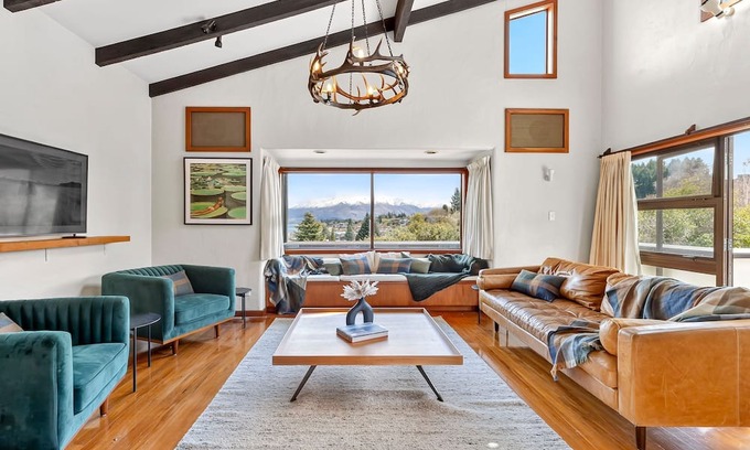 A spacious family friendly house setup for hosting multiple families with 9 beds across 5 bedrooms and 3 full bathrooms. Four of the bedrooms have Queen beds (one also with a single) and the final fifth bedroom has two bunks. Hop, skip and a jump to town! Sitting proud with wide lake and mountain views, this lodge oozes cozy 80s charm. Featuring a large main lounge with wood burning fireplace and a separate dining and sitting room. Off street parking for cars or a boat during Summer. Soak in the hot tub after a day of hiking or hitting the slopes. Games room available for some fun! This really is an 80s time machine house! Think 80s kitchen tiles, a light switch for every light, retro glass shower doors and patterned wallpaper throughout the home. We look forward to hosting you.