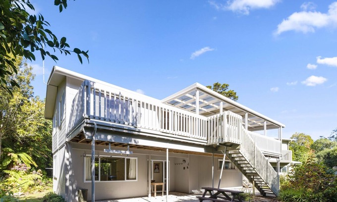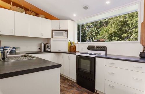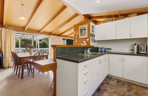 This spacious, quintessential Kiwi bach is lovingly furnished for comfort and decorated with pieces created by a local artist. You’ll feel right at home in the open-plan living and dining area, where large picture windows let natural light flood in, and sliding glass doors provide seamless indoor-outdoor flow onto the large, partly-sheltered deck.