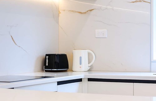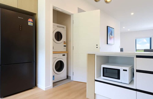This townhouse offers three bedrooms and two bathrooms, including a private master ensuite. The open-plan living and dining area is filled with natural light, while the fully equipped kitchen features an induction cooktop, oven, dishwasher, and all the essentials for longer stays. A private outdoor area provides extra space to relax after a day of exploring or working.