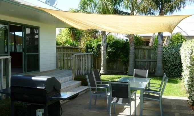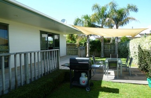 Modern three bedroom house, situated in quiet cul-de-sac with large deck and entertaining area with shade sail and outdoor lighting. Fully equipped kitchen with all modern conveniences, Heat pump to keep you toasty and warm in winter. Separate shower and bath in bathroom. Laundry facilities in garage. Large smart tv with freeview and wifi .2 min walk to beach. Large hooded gas barbeque. Plenty of parking for boats and cars. Walking distance to town, restaurants and cafes.