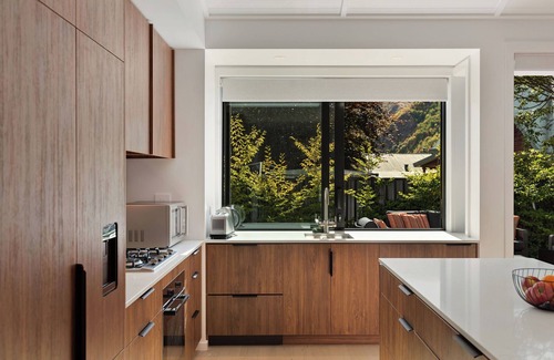 One downstairs bedroom, and two upstairs bedrooms, both upstairs bedrooms offering walk-in -wardrobes, and ensuites. A designated workspace is also available for remote working. Large, modern kitchen with amenities for cooking onsite if required. Washing machine and dryer facilities are also available onsite. Beautiful private landscaped outdoor area with outdoor furniture for dining and relaxing. Garage carpark available, for safe storage of skiis and bikes, as well as an additional off-street park outside the front entrance.
