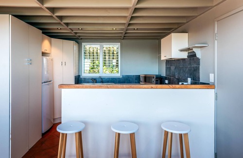 Spinnaker Watch is a light-filled, two-storey holiday home set high above the water, offering sweeping views across the bay to Auckland City. The outlook is ever-changing ferries gliding across the harbour by day and the city lights twinkling on the horizon by night. Its a peaceful and private spot, yet conveniently close to the Kennedy Point Ferry, Palm Beach, and Oneroa Village.