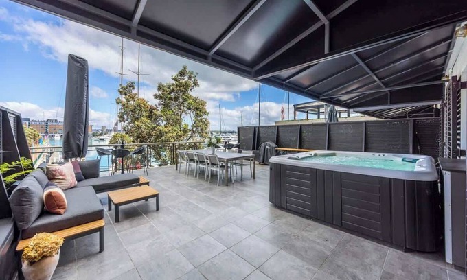 Located in the heart of Auckland’s vibrant CBD, this gorgeous apartment offers breathtaking waterfront views overlooking the Viaduct Harbour from your huge private outdoor terrace. With easy access to the city’s very best dining and retail, it’s the perfect retreat to experience The City of Sails. Enjoy a modern living space and relax on the terrace featuring an XL spa pool, outdoor lounge, and dining area. With two secure carparks, this apartment is ideal for a luxurious Auckland stay.