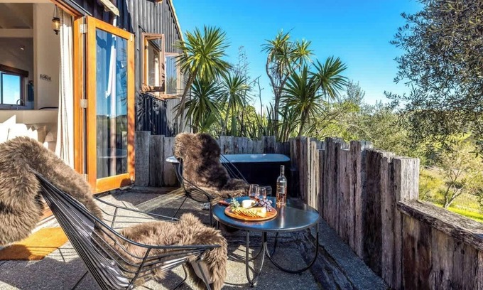 The light filled, loft-style accommodation is pure luxury and fully equipped to a high specification. Guests enjoy the superior king bed with crisp cotton sheets, plush bathrobes and locally made bath products as well as everything required for a lovely day at the beach. A full self catered breakfast is provided daily consisting of organic eggs, bacon, muesli, yoghurt, fresh fruit, jam and bread along with an assortment of beverages. Come to The Loft and relax, soak in the outdoor bath, curl up in front of the log fire or venture out to explore the estate. Have a walk through the olive grove and vineyard, enjoy the harvest from the large kitchen garden, find fresh eggs in the hen house, tramp through an acre of native bush with several 1000 year old Puriri trees or picnic in the shade of huge Pohutukawas overlooking the neighboring vineyards. The property shares boundaries with several award winning vineyards and restaurants including Miro/Casita Miro, Stonyridge, Te Motu and Obsidian…making spectacular wine and food a short stroll away. A 10-minute walk down the hill leads to picturesque Onetangi beach with it’s 2.5 kilometers of white sand and a further 10-minutes down the beach leads to the local pub.