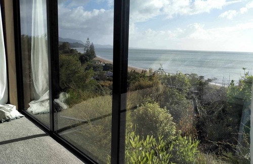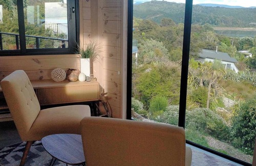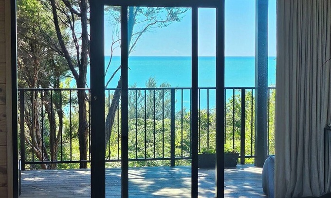 Treetops Lookout is a newly built, architecturally designed two bedroom two-bathroom spacious house, nestled amongst native treetops in Parapara, Golden Bay, with views to the ocean and bush.