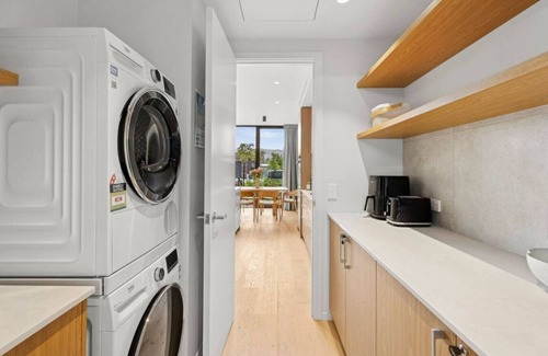 Downstairs, the open-plan kitchen, dining, and living area is the heart of the home, featuring a fully equipped kitchen with all the extras (air fryer, coffee pod machine, rice cooker, and more). There’s also a separate toilet, a separate laundry with washer and dryer, and a double garage for secure bike/ski/snow gear storage, plus plenty of parking in the garage and outside.